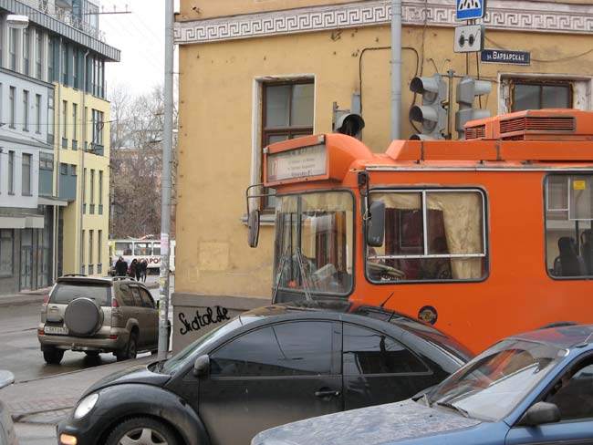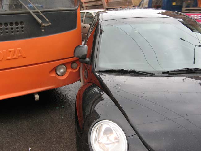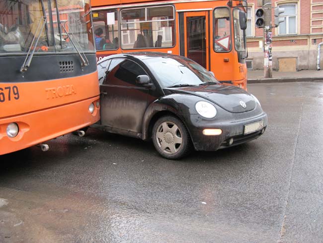Сегодня утром перекресток ул. Варварской и ул. Пискунова в Нижнем Новгороде стал испытательным полигоном. На этом псевдополигоне испытывал судьбу водитель Фольксвагена Жук. Он решил опередить на вираже и выехать на Пискунова с Варварки раньше троллейбуса. Но уверенно шедший вперед на крейсерской скорости троллейбус нарушил маневр водителя Фольксвагена.